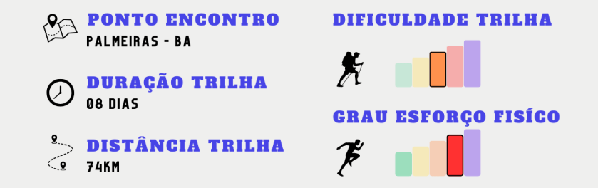 Nosso ponto de encontro será na cidade de Palmeiras, na Bahia, onde você chegará pela rodoviária. Nos encontraremos em uma pousada na cidade. Recomendamos que chegue cedo na cidade para ter tempo de comprar lanches para comer durante a trilha. À noite, teremos um ultimo briefing sobre a expedição para que você esteja bem preparado para a jornada que se inicia. A noite será livre para o jantar (não incluído), e você poderá descansar confortavelmente em um quarto compartilhado.